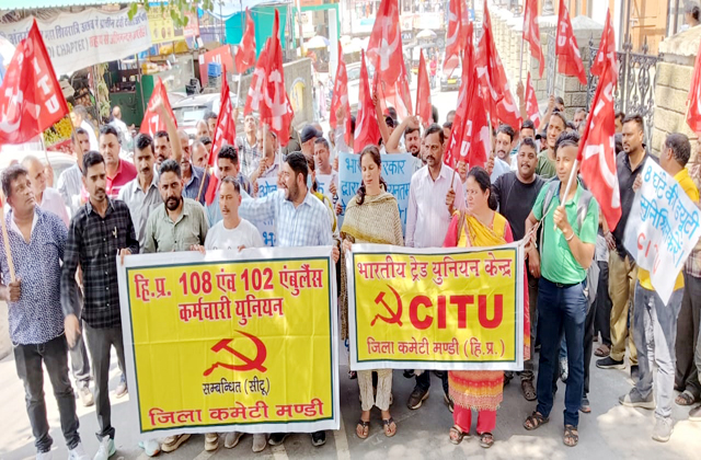 मंडी (रीता): मंडी जिले में 102 और 108 एम्बुलैंस कर्मचारी यूनियन के 150 से अधिक कर्मचारी हड़ताल पर रहे। शुक्रवार को इन कर्मचारियों ने मंडी जिला मुख्यालय में रैली निकाली और कंपनी प्रबंधन व राष्ट्रीय स्वास्थ्य मिशन (एनएचएम) के खिलाफ नारेबाजी की। उसके उपरांत डीसी के माध्यम से एनएचएम शिमला के निदेशक को मांग पत्र भेजा गया। प्रदर्शन का नेतृत्व सीटू जिला प्रधान भूपेंद्र सिंह, महासचिव राजेश शर्मा, यूनियन प्रधान सुमित कुमार, उपप्रधान संतोष कुमारी, महासचिव संजय कुमार, सचिव पंकज और जितेंद्र कुमार आदि ने किया। भूपेंद्र सिंह ने कहा कि सरकार ने हड़ताल को दबाने के लिए कुछ जिलों में एस्मा कानून लागू कर दिया है, जिसका यूनियन विरोध करती है। उन्होंने स्पष्ट किया कि यदि 15 दिनों में मांगें पूरी नहीं की गईं तो कर्मचारी अनिश्चितकालीन हड़ताल पर चले जाएंगे। आंदोलन के अगले कदम पर निर्णय लेने के लिए यूनियन और सीटू पदाधिकारियों की बैठक 7 अक्तूबर को होगी।