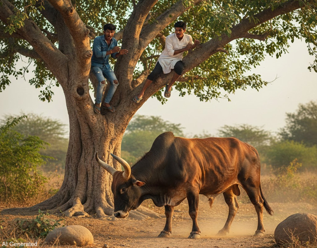 युवकों के पेड़ पर चढ़ने के बाद भी बैल का गुस्सा शांत नहीं हुआ। वह लगातार पेड़ के नीचे खड़ा होकर उन्हें घूरता रहा। सुबह करीब 10 बजे जब एक अन्य ग्रामीण खेत की तरफ गया तो पेड़ पर बैठे युवकों ने आवाज लगाकर मदद मांगी। सूचना मिलते ही मौके पर ग्रामीणों की भीड़ जमा हो गई। बैल के आक्रामक रवैये को देखते हुए कोई भी बैल के पास जाने की हिम्मत नहीं कर सका। बाद में ग्रामीणों ने फिल्मी अंदाज में ट्रैक्टर को पेड़ के पास लगाया और दोनों युवकों को सीधे ट्रैक्टर पर बैठाकर खेत से बाहर निकाला। इस दौरान भी बैल वहीं खड़ा देखता रहा।