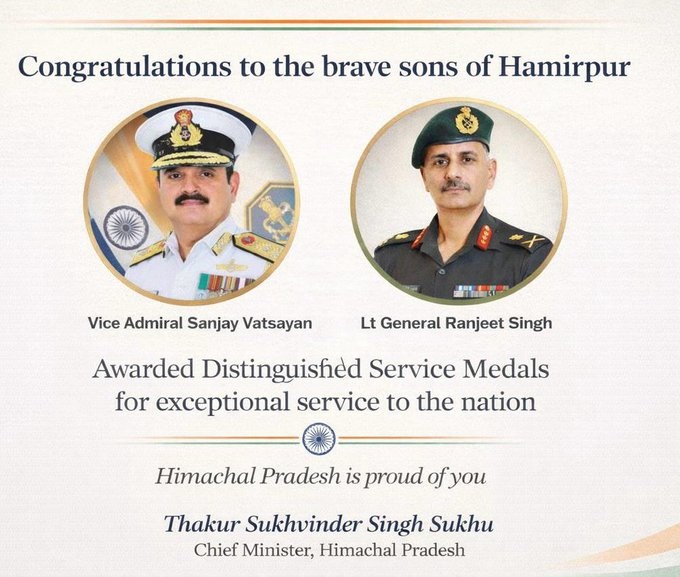 मुख्यमंत्री ने अपने सोशल मीडिया अकाउंट एक्स पर लिखा, "हमीरपुर से संबंध रखने वाले वाइस एडमिरल संजय वात्स्यायन को परम विशिष्ट सेवा पदक तथा लेफ्टिनेंट जनरल रंजीत सिंह को अति विशिष्ट सेवा पदक से सम्मानित किया जाना प्रदेश एवं देश दोनों के लिए अत्यंत गौरव का विषय है। राष्ट्र के प्रति आपकी उत्कृष्ट सेवा, अनुशासन और नेतृत्व आने वाली पीढ़ियों के लिए प्रेरणास्रोत है। हिमाचल प्रदेश आपकी इस उपलब्धि पर गर्व करता है। आप दोनों को हार्दिक बधाई एवं शुभकामनाएं।"