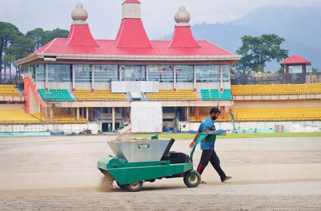 Kangra: क्रिकेट स्टेडियम धर्मशाला के मैदान में राई घास का बीज डालने का काम शुरू