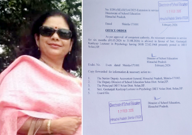 शिमला (ब्यूरो): स्वास्थ्य मंत्री धनीराम शांडिल की बेटी व भाजपा के 2 बार के पूर्व प्रत्याशी रहे राजेश कश्यप की पत्नी गीतांजलि कश्यप को 6 माह का सेवा विस्तार मिला है। गीतांजलि कश्यप शिक्षा विभाग में साइकोलॉजी के लैक्चरार पद पर कार्यरत हैं और वर्तमान में जिला शिक्षा एवं प्रशिक्षण संस्थान (डाईट) सोलन में तैनात हैं। वह इसी माह सेवानिवृत्त होने वाली थीं, लेकिन इसी बीच प्रदेश सरकार ने उन्हें 1 मार्च से 31 अगस्त, 2026 तक का सेवा विस्तार दे दिया है। गीतांजलि के सेवा विस्तार से संबंधित आदेश स्कूल शिक्षा निदेशालय की ओर से जारी हो गए हैं।