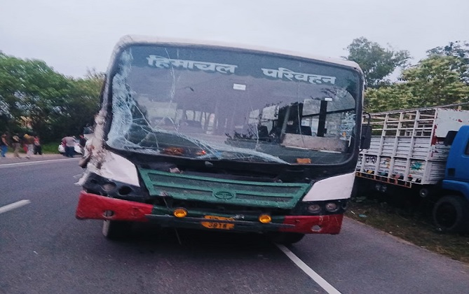 Hamirpur : मैड़ के पास HRTC बस और ट्रक की जोरदार टक्कर, चालक को आई चोटें