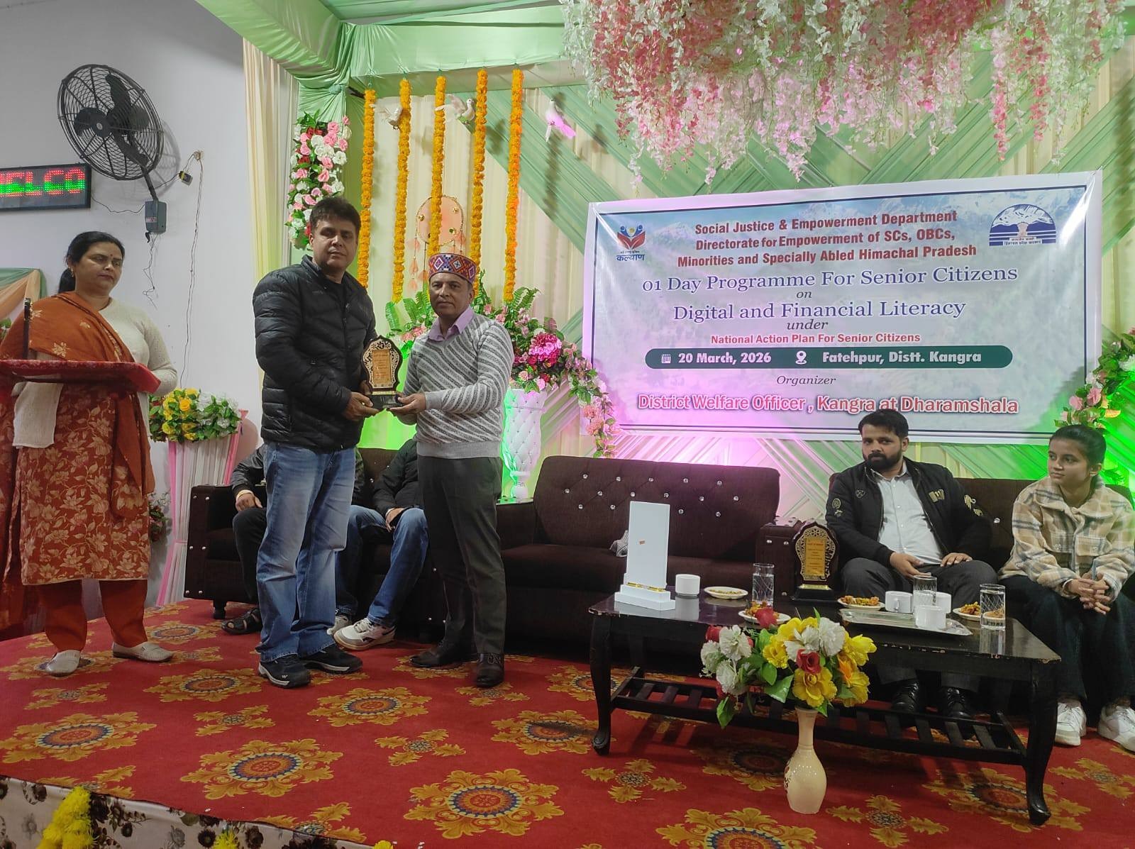 Kangra (राहुल राणा) : डिजिटल युग में बढ़ती ऑनलाइन सेवाओं और साइबर धोखाधड़ी के जोखिम को देखते हुए फतेहपुर में वरिष्ठ नागरिकों को जागरूक करने के उद्देश्य से एक विशेष कार्यक्रम आयोजित किया गया। सामाजिक न्याय एवं अधिकारिता विभाग के तहत जिला कल्याण अधिकारी, कांगड़ा द्वारा “डिजिटल और वित्तीय साक्षरता” विषय पर यह कार्यक्रम आयोजित किया गया, जिसमें बड़ी संख्या में वरिष्ठ नागरिकों ने भाग लिया।
