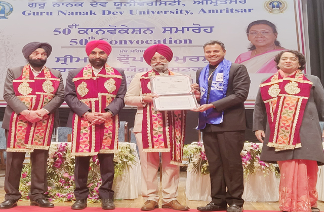शिमला (अभिषेक): हिमाचल प्रदेश कैडर के आईएएस अधिकारी डा. ललित जैन को विधि विषय में डाक्टरेट (पीएच.डी.) की उपाधि से सम्मानित किया है। उन्हें यह उपाधि गुरु नानक देव विश्वविद्यालय अमृतसर में आयोजित दीक्षांत समारोह में राष्ट्रपति द्रौपदी मुर्मू की उपस्थिति में प्रदान की गई। समारोह में पंजाब के राज्यपाल गुलाब चंद कटारिया उपस्थित रहे। वर्तमान में वह भारत सरकार में केंद्रीय प्रतिनियुक्ति पर निदेशक जनगणना संचालन एवं नागरिक पंजीकरण गृह मंत्रालय में कार्यरत हैं। डा. ललित जैन का शोध प्रबंध हिमाचल प्रदेश भू-स्वामित्व एवं भूमि सुधार अधिनियम, 1972 की धारा 118 का कारोबार सुगमता और उद्यमशीलता के इरादों पर प्रभाव विषय पर आधारित है। इस शोध में भूमि सुधार, कारोबार सुगमता, पर्यावरण संरक्षण, जलवायु परिवर्तन और सतत उद्यमशीलता जैसे पहलुओं का व्यापक कानूनी व नीतिगत विश्लेषण किया गया है, जिसमें हिमाचल प्रदेश पर विशेष फोकस है।