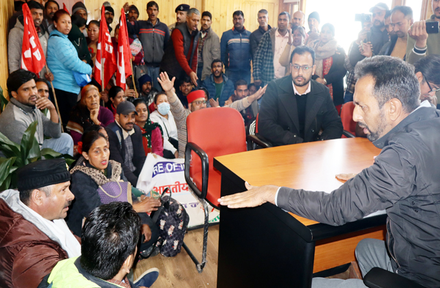 शिमला (वंदना): शिमला में अतिक्रमण को लेकर नगर निगम की कार्रवाई से गुस्साए तहबाजारियों ने वीरवार को नगर निगम कार्यालय में घुसकर घंटों तक हंगामा किया। इस दौरान सीटू के बैनर तले तहबाजारियों ने प्रशासन के खिलाफ जमकर नारेबाजी व धरना-प्रदर्शन किया। प्रशासन की ओर से बीते रोज लक्कड़ बाजार से आईजीएमसी के निरीक्षण के दौरान अतिक्रमण करने वाले तहबाजारियों का सामान जब्त किया गया था, जिस पर तहबाजारी भड़क गए थे। तहबाजारी प्रशासन पर तहबाजारियों को उजाड़ने का आरोप लगा रहे हैं, साथ ही इस दौरान एक महिला की बाजू फ्रैक्चर होने को लेकर तहबाजारी निगम कर्मचारियों पर कार्रवाई की मांग कर रहे थे।