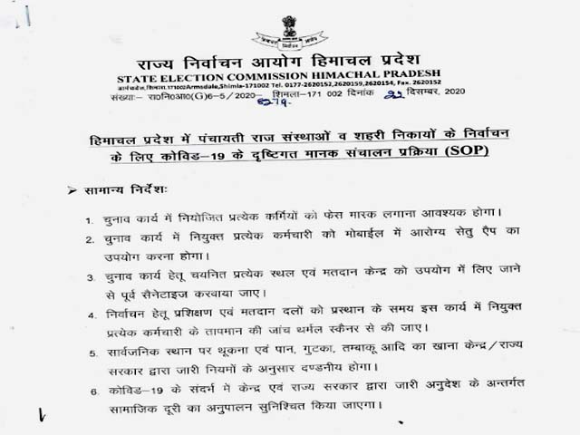 शिमला (कुलदीप): राज्य चुनाव आयोग ने स्थानीय निकाय एवं पंचायती राज संस्थाओं के चुनाव को लेकर एसओपी जारी कर दी है। इसके तहत कोरोना संक्रमण को ध्यान में रखते हुए 5 लोगों की टोली ही डोर-टू-डोर चुनाव प्रचार कर सकेगी। साथ ही नुक्कड़ सभाओं के लिए 50 लोगों की शर्त लगी रहेगी।