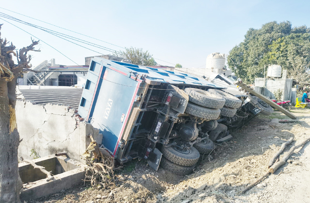 ठाकुरद्वारा (गगन): मिलवां-ठाकुरद्वारा सड़क मार्ग पर निर्माण कार्य तेजी से जारी है। इसके बावजूद भारी वाहन चालक तेज रफ्तार में वाहन चलाने से बाज नहीं आ रहे। आए दिन खनन मटीरियल से भरे टिप्पर पलट रहे हैं। स्थानीय लोगों व सरकारी संपत्ति को नुक्सान पहुंचा रहे हैं। बीती रात बसंतपुर में पंजाब की ओर जा रहा खनन मैटीरियल से भरा एक टिप्पर अचानक अनियंत्रित होकर एक घर पर पलट गया। घर के मालिक के अनुसार, रात लगभग साढ़े तीन बजे तेज धमाके की आवाज सुनाई दी। बाहर निकलकर देखा तो खेत में बने मोटर कमरे व शौचालय को तोड़ता हुआ टिप्पर उनके घर की चारदीवारी पर गिरा हुआ था।