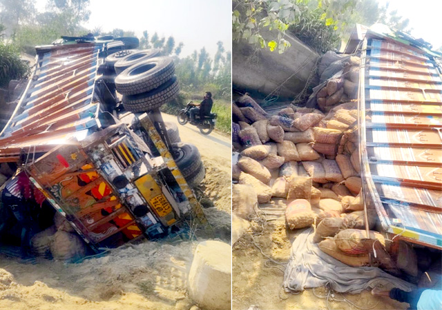 जानकारी के अनुसार शनिवार देर रात आलुओं की बाेरियाें से लदा एक ट्रक इस खतरनाक रास्ते पर अपना संतुलन खो बैठा और पलट गया। गनीमत रही कि इस हादसे में चालक बाल-बाल बच गया। इससे ठीक एक दिन पहले, शुक्रवार देर रात भी टाइल्स से भरा एक ट्रक इसी जगह पर दुर्घटना का शिकार हुआ था। यह स्थान पहले भी एक जानलेवा हादसा देख चुका है। कुछ महीने पहले संतोषगढ़ निवासी एक युवक की दोपहिया वाहन पर जाते समय इसी जगह हादसे का शिकार हाे गया था। गंभीर रूप से घायल होने के बाद उसने पीजीआई चंडीगढ़ में दम तोड़ दिया था।