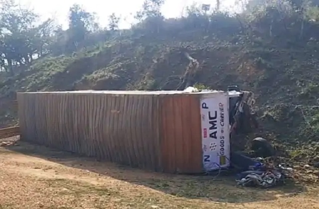 देहरा (कांगड़ा): हिमाचल प्रदेश के कांगड़ा जिले में नेशनल हाईवे-503 (मुबारकपुर-रानीताल मार्ग) पर मंगलवार सुबह एक भीषण सड़क हादसा पेश आया। माता चिंतपूर्णी मंदिर के समीप ढलियारा के तीखे मोड़ पर मारुति की पांच नई कारों से लदा एक विशालकाय ट्रेलर ट्रक अनियंत्रित होकर गहरी खाई में जा गिरा। ट्रक सुरक्षा के लिए लगाए गए 'रोल क्रैश बैरियर' को तोड़ते हुए सीधे नीचे स्थित राधा स्वामी सत्संग भवन के मैदान में जा गिरा।