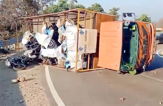 Himachal: कार चालक की लापरवाही पड़ी भारी...हाईवे पर पलटा ट्राला, नई बाइक्स और स्कूटियाें के उड़े परखच्चे