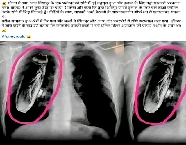 बता दें कि सोशल मीडिया पर इन दिनाें एक एक्स-रे कॉपी सोलन और शिमला के अस्पताल की बताकर वायरल हो रही है। इस पोस्ट में डाली गई एक्स-रे कॉपी में मरीज के सीने में काॅकरोच दिख रहा है। इसके साथ ही पोस्ट में लिखा गया है कि क्षेत्रीय अस्पताल सोलन में एक सिंगापुर से आए पर्यटक को सीने में दर्द हुआ। इसके बाद वह उपचार के लिए सरकारी अस्पताल आए और वहां एक्स-रे करवाया। एक्स-रे की रिपोर्ट लेकर अस्पताल के चिकित्सक के पास गए, ताे वहां उन्हें बताया कि सीने में जिंदा तिलचिट्टा है। इसके बाद उन्हें तुरंत सिंगापुर जाने की सलाह दी गई। इसके बाद वह वापस सिंगापुर लौट गया और वहां चिकित्सक की ओर से जांच के दौरान पाया कि कॉकरोच मरीज की छाती में नहीं बल्कि एक्स-रे मशीन में था।